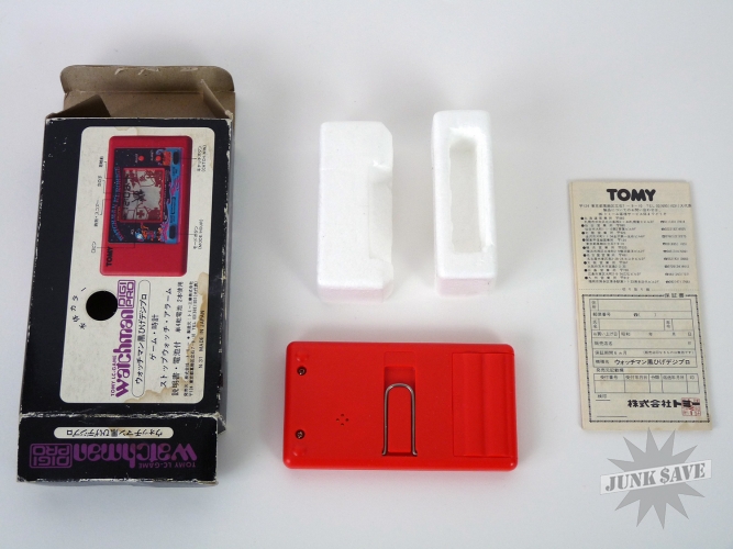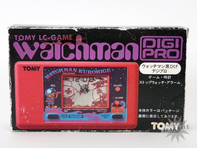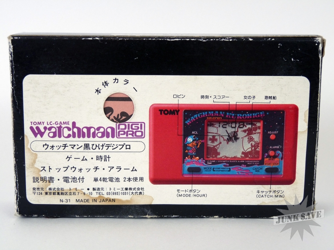 Rare vintage game release by Tomy (Tomytronic!) called Kurohige which translates to Blackbeard so this is a pirate themed game in their amazingly named "Watchman Digipro" series. Unfortunately the game has LCD screen and gameplay problems, so this is being sold for parts and repair. It is a scarce game and good to find the box and styrofoam and instruction manual. Box is tattered but game is in good cosmetic condition.