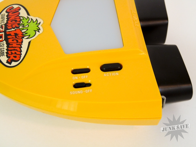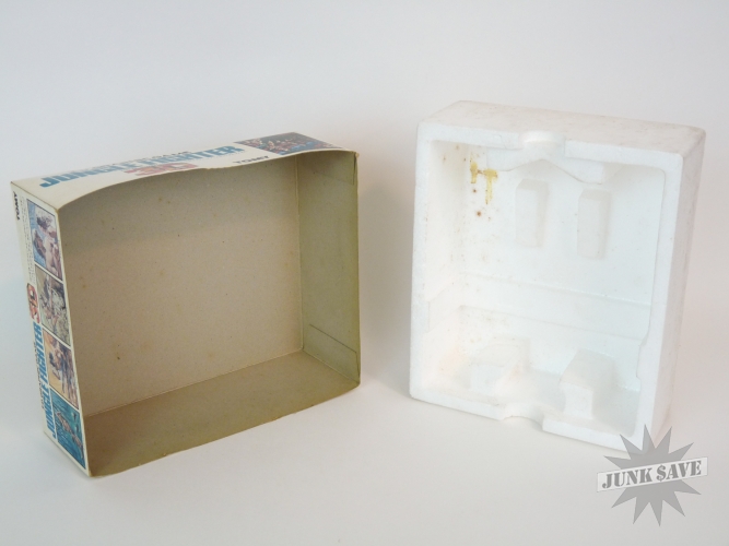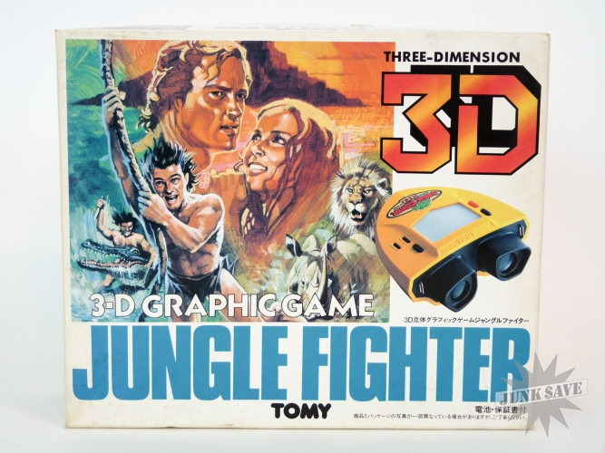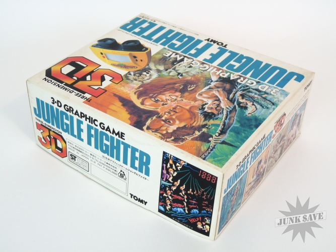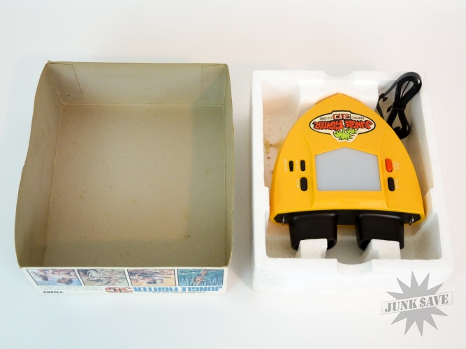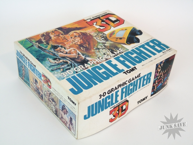 3-D video game by Tomy (Tomytronic) called Jungle Fighter, this game is rare and only had a very limited release in Japan. Jungle Fighter is one of the best in the 3-D binoculars handheld series by Tomy, basically a Tarzan / Jungle Hunt type game with vines, alligators and natives in beautiful color LCD. Original box is very nice with bright white and colors, styrofoam has some wear though. The game itself is excellent with only minimal use, the case, sticker, buttons, labels, battery cover, everything is quite nice, the only negative worth mentioning is a couple of the battery contacts were once a little corroded but looks like someone scraped the corrosion off. The game works perfectly. No instruction manual but the plastic necklace strap is there like new.