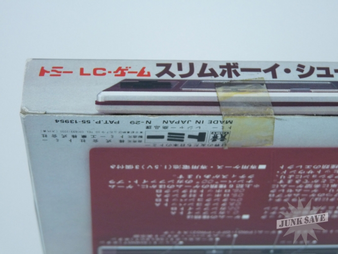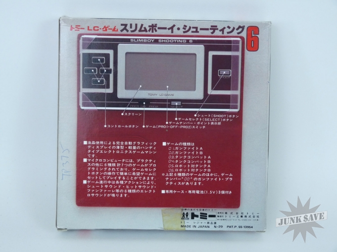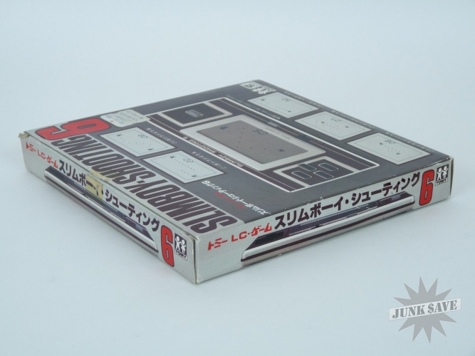 Very rare minty boxed Japanese version of Tomy Slimboy Shooting 6 (released as Slimline Shooting in other countries). Vintage 1980s handheld electronic LCD video game that comes housed in a cool vinyl case. This is new old dealer stock - the game is mint and never played except for testing. Game works great - sound controls screen sprites all good. The box still has a price sticker on it, the factory tape which has been cut open, and on the back is written in pen "TP 375". Great classic "Tomytronic" game and rarely seen in this unplayed condition.