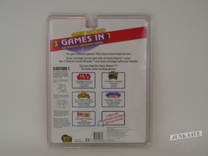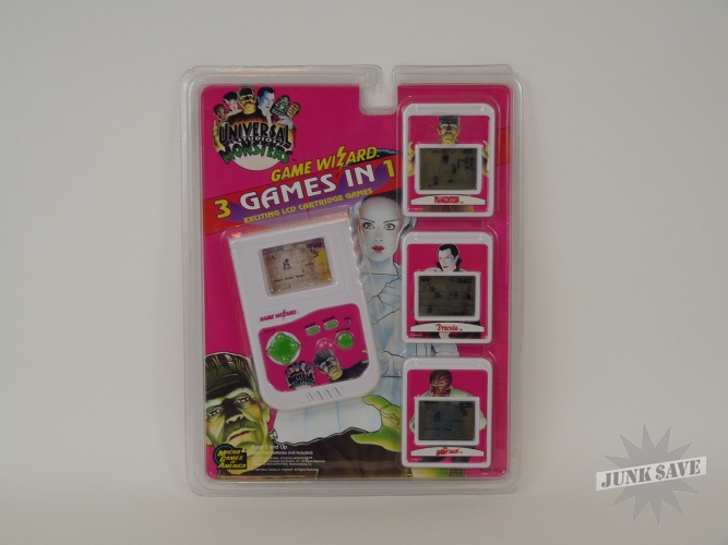 Universal Monsters LCD video game system by MGA (Micro Games of America) from the 1990s. Extremely rare release. 3 different game cartridges to play Dracula, Wolfman, or Frankenstein. The package has been cut open on the right side and the games have been played a few times but this is in nearly new condition and everything still stays in place inside the box. MGA released Star Wars and Power Rangers games in this same format, but the Monsters release is the most difficult to find.