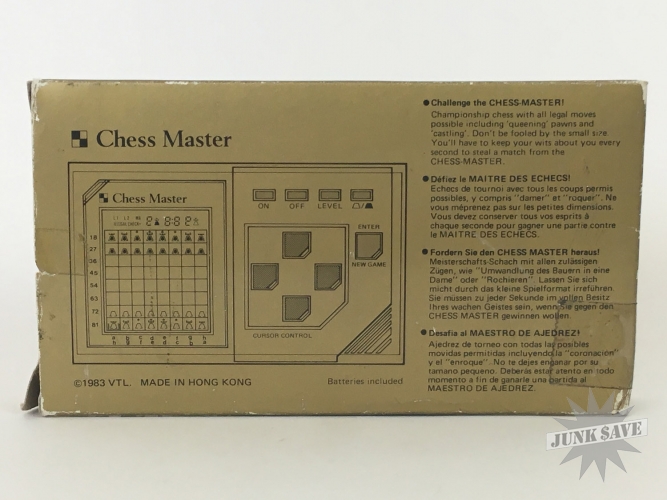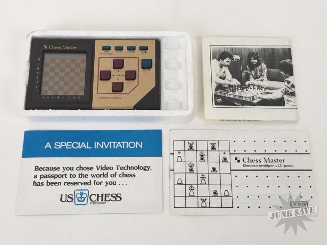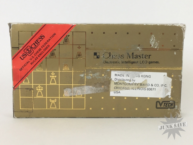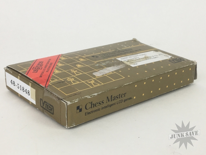 Vintage V-Tech "Chess Master" LCD game, with box, styrofoam, and instructions and other US Chess related paper work. Game looks to be in unused new condition, metal control panel plate even still has the plastic coating on it. However after testing the game it will not turn on. We tried various batteries and at one point heard some electronic chirp sounds which is usually a good sign, but we could not raise it from the dead. You might have better luck! We are selling broken in as-is condition for parts and repair only. Also you can see the box has some stickers on it including one from "Montgomery Ward". This is a very rare V-Tech 1980s release.