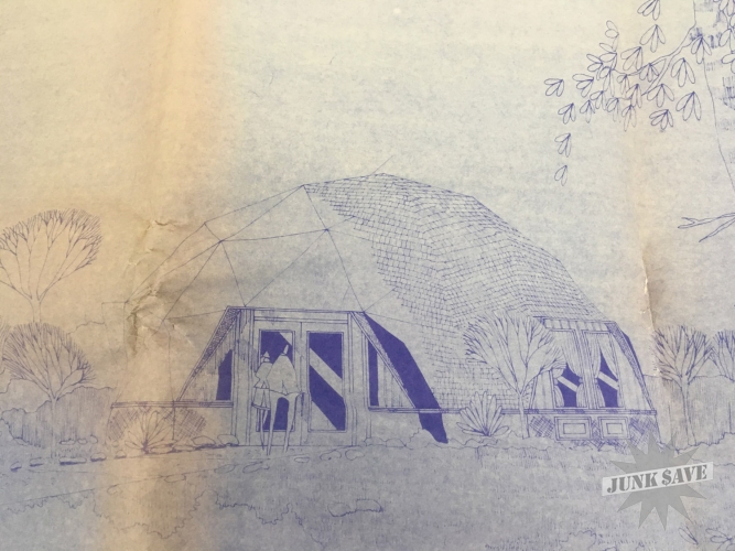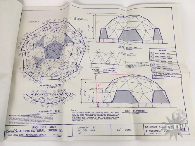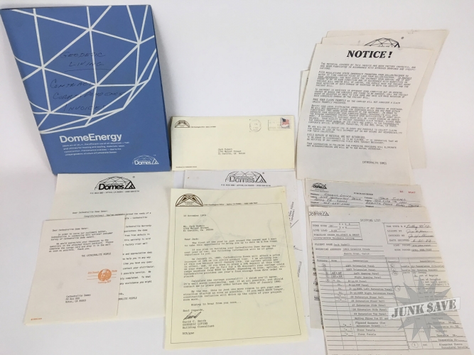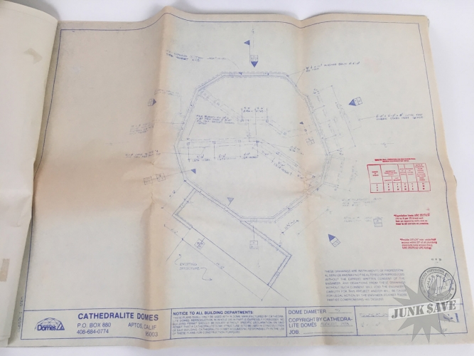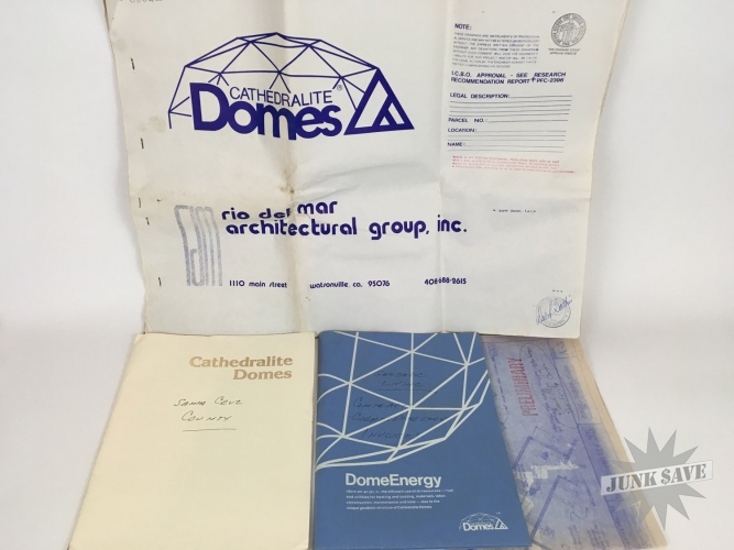 Lot of architecture plans and other documents related to one particular Cathedralite Domes geodesic house construction project back in 1979. Have never seen the house in person don't know if it still stands in Santa Cruz CA not far from "The Mystery Spot", the entire stash here was found at a California estate sale. We love domes and were eager to preserve this lot of papers which could be categorized into 3 sections: the dome house plans, original Cathedralite ephemera, and assorted project related documents.