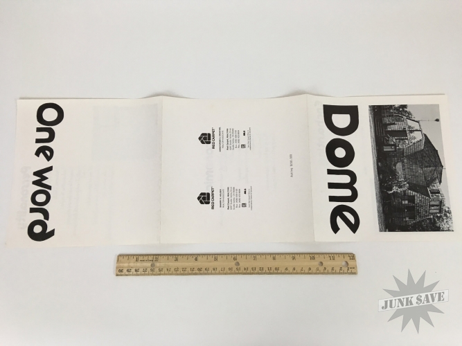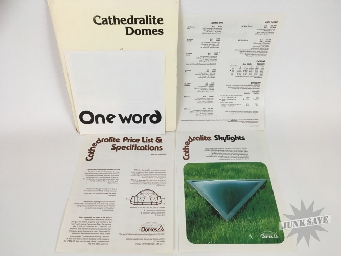The white Cathedralite Domes folder contains marketing materials: a couple price list spec documents (1978 and 1980), a skylights flyer, and a nice 3 page "one word: dome" foldout brochure.