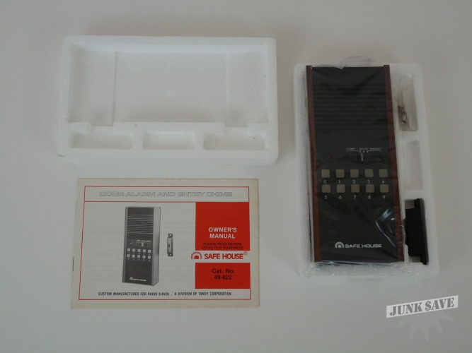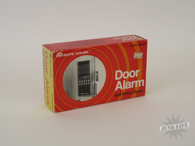 Vintage door alarm and entry chime, retro wood grained design by Safe House, sold by Tandy / Radio Shack. Alarm mode is loud, chime mode is a more pleasant sound. Exit/entry delay prevents false alarms, code entry sets and shuts off alarm. Requires a 9V battery, not included. Brand new, dead stock.