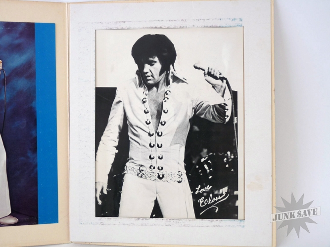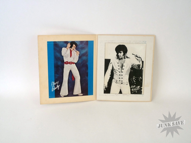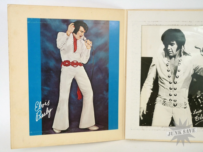 Rare souvenir photos from the 1972 Elvis shows at the Las Vegas Hilton. Glossy 8 x 10 photos are in their original cheap display folder. This one is notable for having The King's name misspelled as "Presly"... oh the horror! I heard one rumor that The Colonel was furious about this error, threw a fit and had the photos removed from the souvenir booth and destroyed. I've heard another rumor that these weren't official and not sold at the souvenir booth, but rather were sold by pirate dealers in the show's parking lots. The souvenir action was very hot at these shows - everyone wanted to bring home a piece of The King. Photos in good condition, any wear that they have is normal considering they have been stored in the folder album all these years. Folder in good shape for its age, not immaculate, again just normal wear with some yellowing from age and on the inside there are some areas of discoloration caused by contact with the flip side.