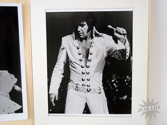 Rare souvenir photos from the 1972 Elvis shows at the Las Vegas Hilton. Glossy 8 x 10 photos are in their original cheap display folder. I heard one story that these were sold at the official show souvenir booth run by The Colonel, and another story that these weren't official but rather were sold by pirate dealers in the parking lots. Either way the souvenir action was very hot at these shows - everyone wanted to bring home a piece of The King. Photos in good condition, any wear that they have is normal considering they have been stored in the folder album all these years. Folder in good shape for its age, not immaculate, again just normal wear with some yellowing from age and on the inside there are some areas of discoloration caused by contact with the flip side.