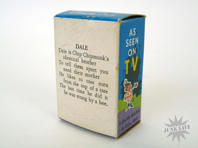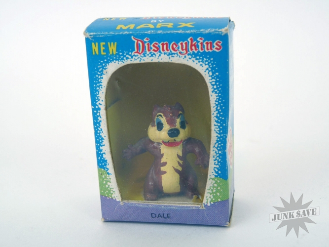 Rare "New Disneykins" figure still in the box, this is Dale the chipmunk. His friend Chip is missing in action, but Dale does just fine and is happy on his own. Dale in great shape, and still has his box. The box still has the plastic window, however with a couple small dings in it, otherwise box is quite clean and sturdy. Hand painted and original.