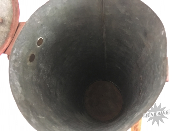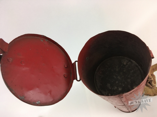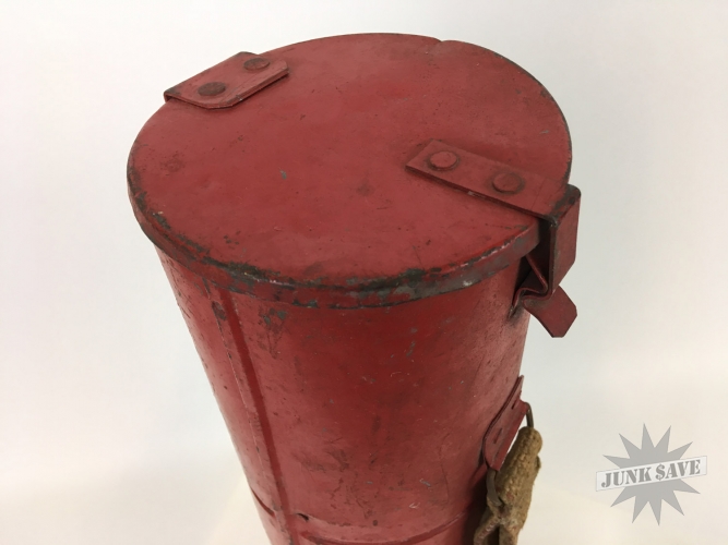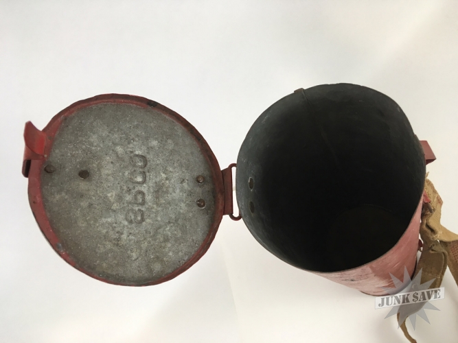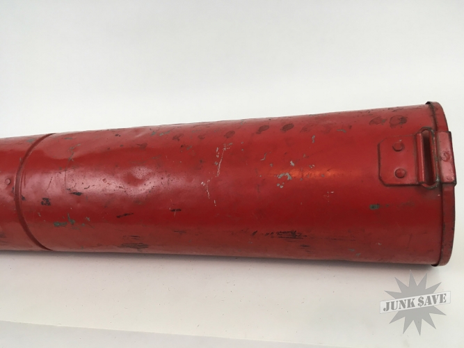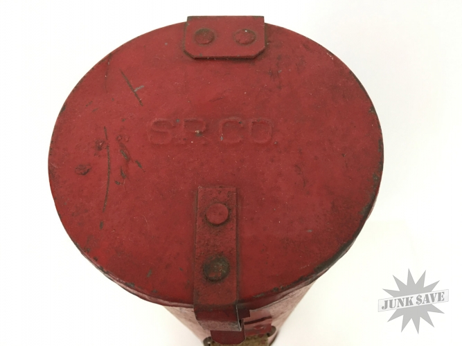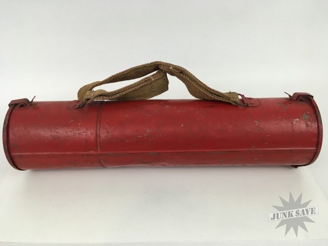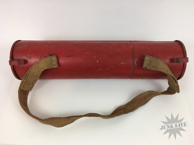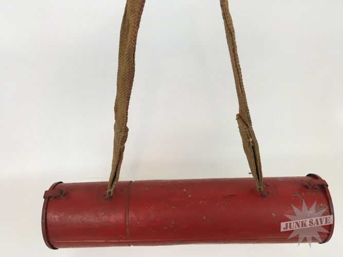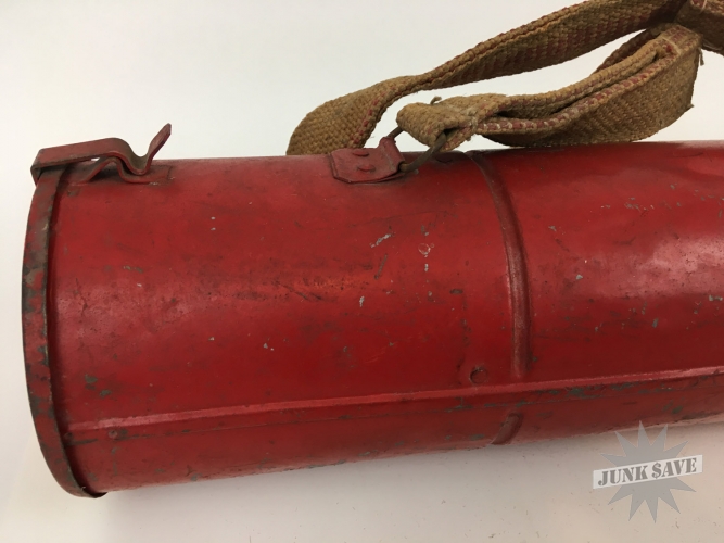 Gorgeous used vintage train engineer box marked SPCO for Southern Pacific Company, red metal with canvas shoulder strap and 2 lidded compartments. Size is 5 inch diameter by 20 inch length. From what we could learn this would have hung in front engine car containing: flares/lights in the smaller compartment that has red painted on the inside, and maps/documents in the larger unpainted compartment. If there was train trouble, the engineer could sling the box over his shoulder, jump out of the train, and have these important tools at his disposal, protected from the elements. Both ends have hinged lids with snap closers, the lids, hinges and snaps all still work good. The thick canvas strap and connecting hardware are also still in good condition for its age. The metal box has plenty of dings and scrapes, but all seem like honest wear giving an overall great used appearance. A very scarce antique railroad item found at estate in the SF Bay Area, have enjoyed it for years time for a new home.