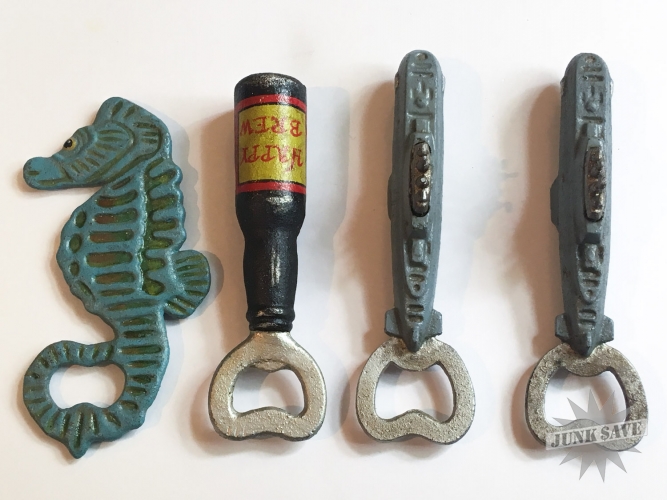 Lot of 8 vintage cast iron "Nautical Bottle Openers" in original wooden store display box. Very rare to find! Top of wooden box slides out and fits into another slot for backdrop display. Based on the low-budget paper label (in the style of Sailor Jerry Tattoos) these do not appear to be the original bottle openers from the 1940s, these look like reproductions made later but not sure of exact age. Still a rare find even for reproductions, the bottle openers have some chips to the paint from living inside the box for awhile, we have added some bubblewrap to protect further damage. Wood box still in great shape, please see photos for which bottle openers are included. Due to weight this is being sold as-is no returns.