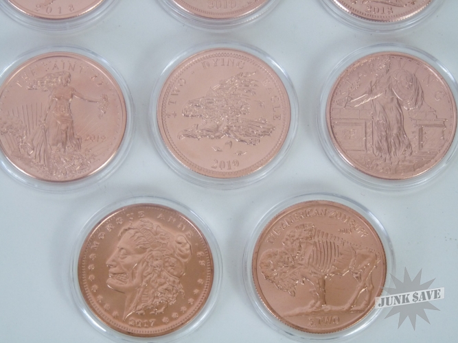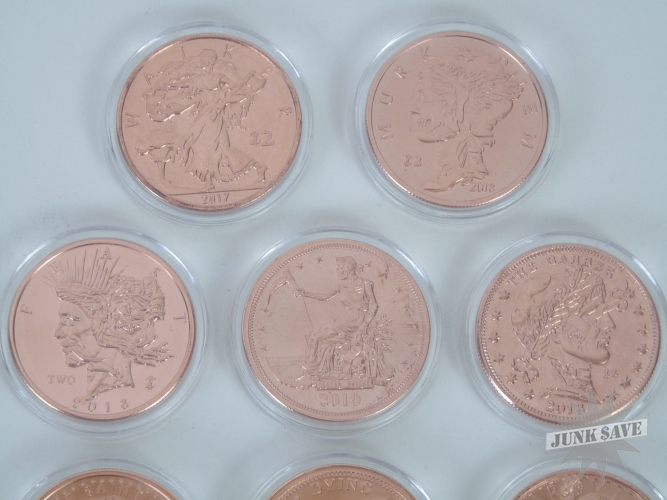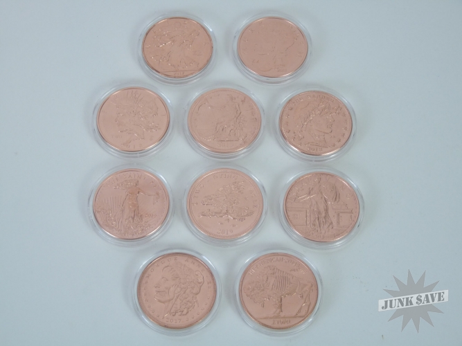 Complete set of all 10 copper 1oz Zombucks - oh yes you will need these someday - the currency of the Apocalypse! Each coin is worth 2 (Z)ombucks, perhaps someday each Z will buy you something such as a box of twinkies. This coin series was made by Provident Metals a couple years back, they released one type every 3 months in limited quantities. Some releases are more rare than others, because the circulation numbers depended upon buyer sales. Each release is a "Zombified" version of an historical US coin series such as Morgan Dollars, Buffalo Nickels, Walking Liberty Half Dollars, etc.
