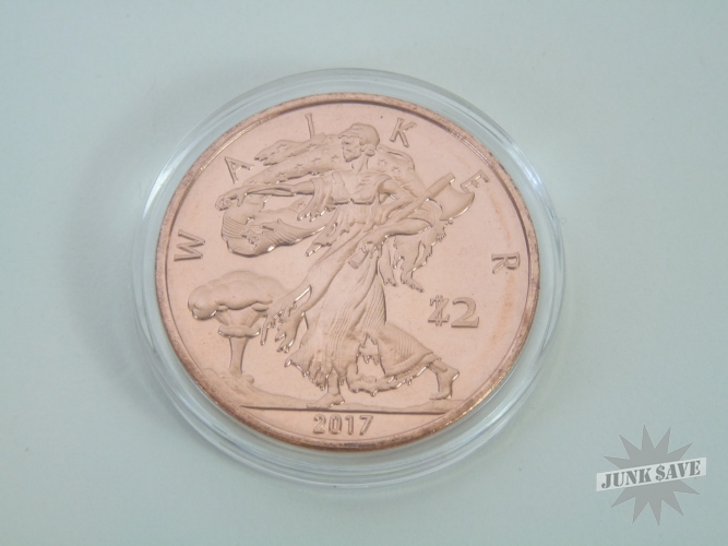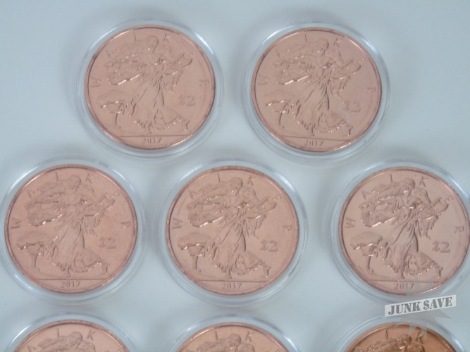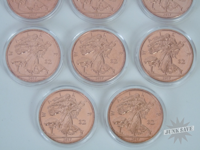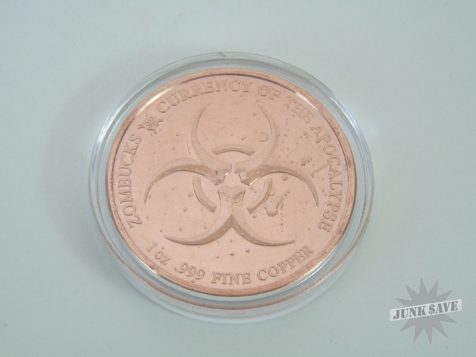 Lot of 10 copper 1oz WALKER Zombucks. Each Walker is worth 2 (Z)ombucks, perhaps someday each Z will buy you something such as a box of twinkies. Made by Provident Metals a couple years back, they released one type every 3 months in limited quantities. Some releases are more rare than others, because the circulation numbers depended upon buyer demand. This was the very first release, and so was made in smaller quantities because the Zombucks were still highly secretive. This release is a "Zombified" version of the historical US coin series known as the Walking Liberty Half Dollars - the perfect metaphor for hungry walking zombies.
